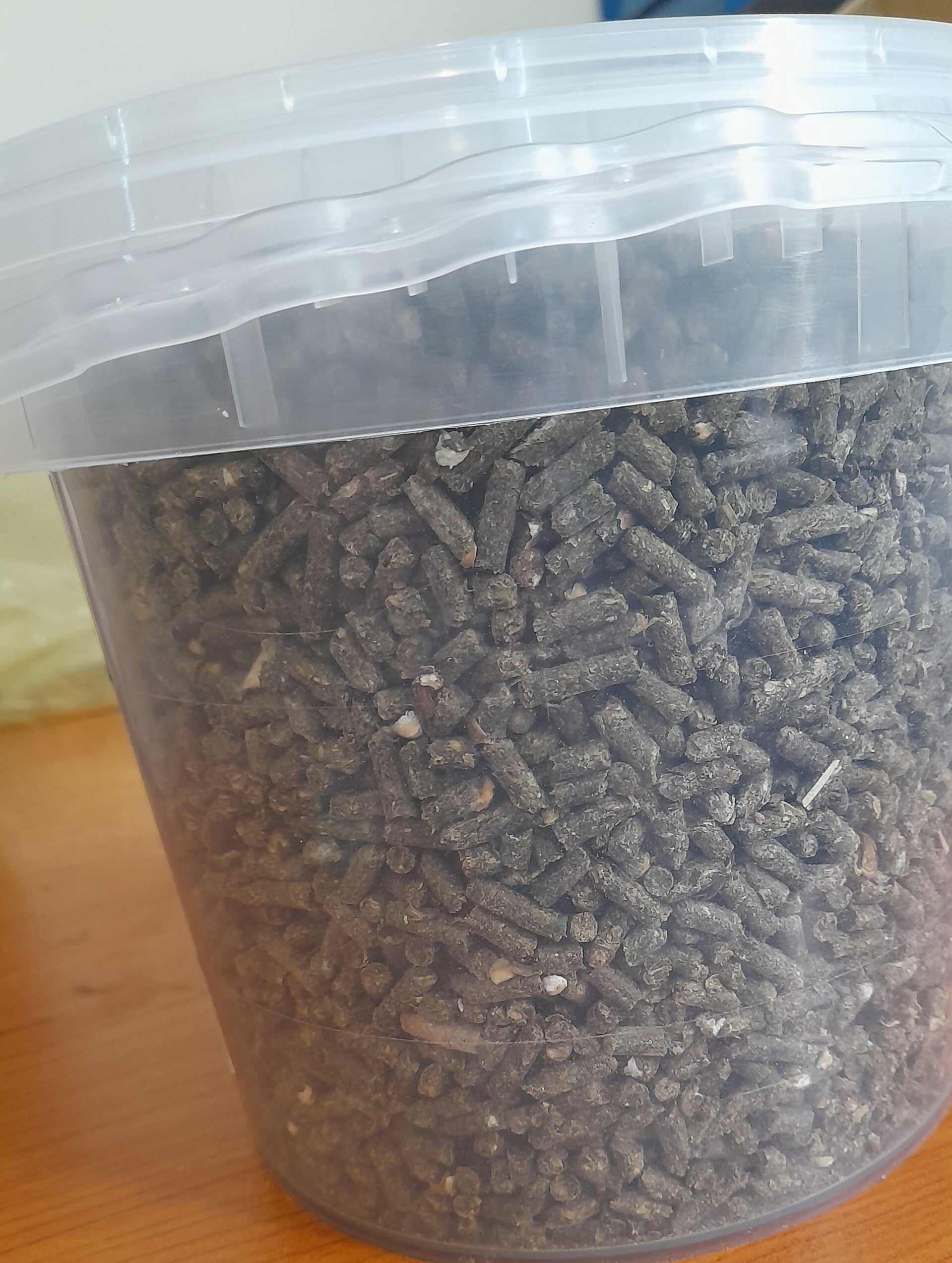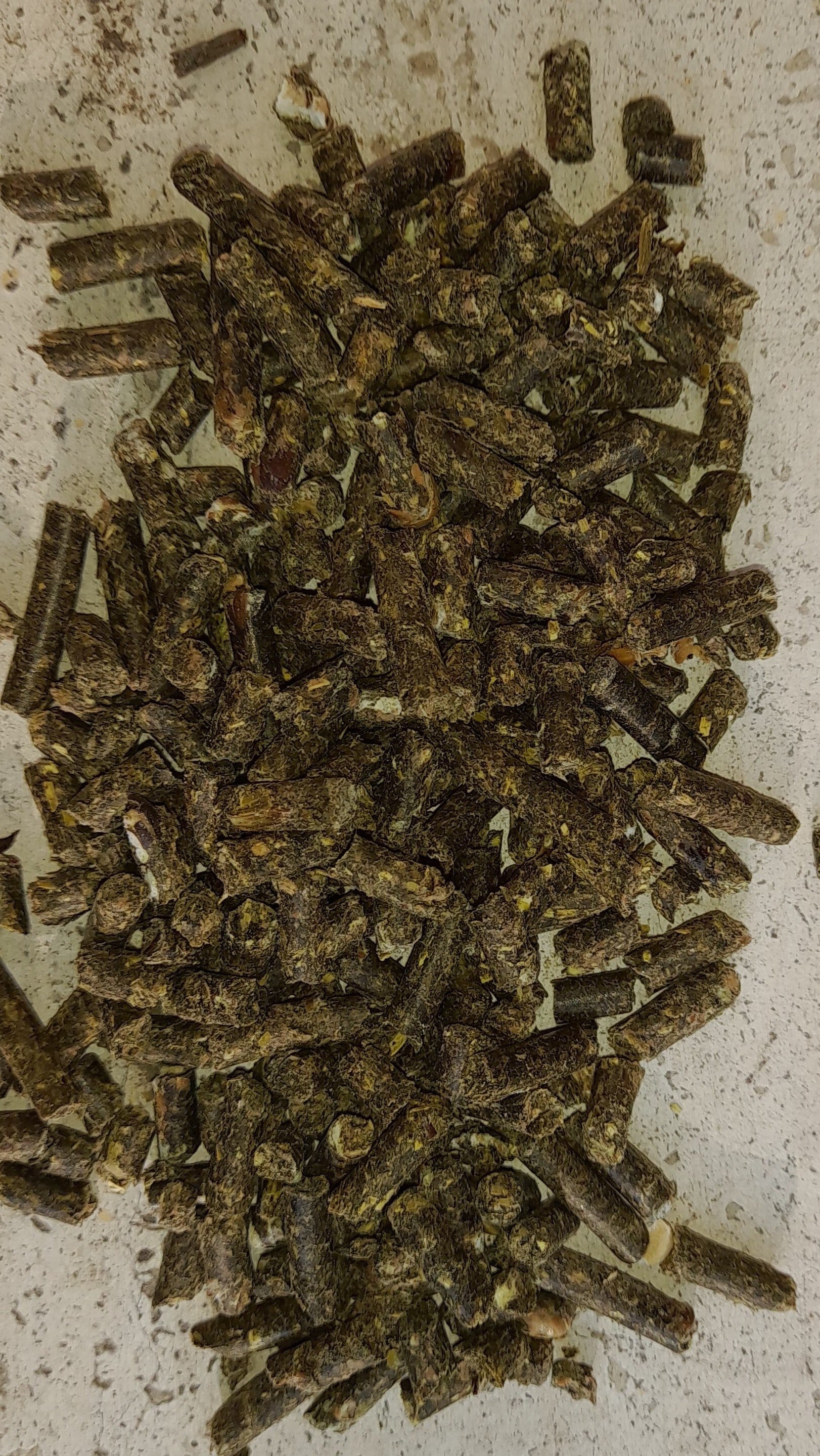 Mangime complementare in pellet con semi di lino estruso, erba medica alf alfa / fieno alpino pellettati , carote estruse.